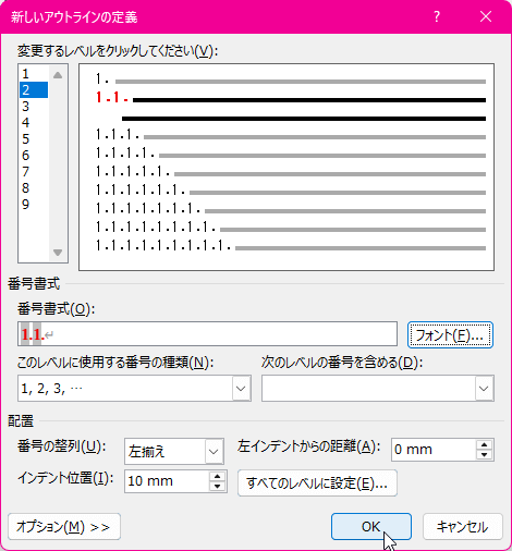 - 番号書式がプレビューに反映されたら[OK]ボタンをクリックします。