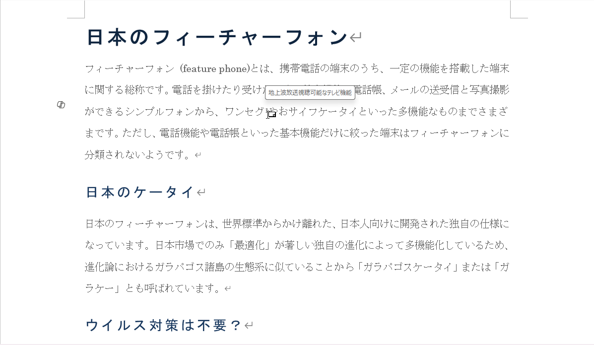 - 2ページ目4行目の「ワンセグ」の後ろにカーソルを移動します。