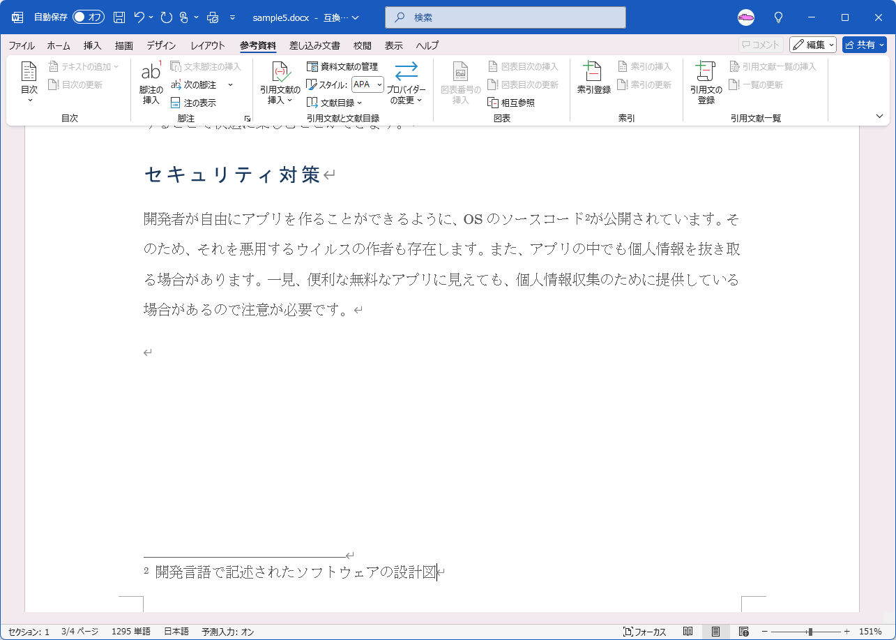 専門用語に対してページの最後に脚注を挿入することができます。ここでは、サンプルファイルを開き、それぞれの語句に脚注をつけてみましょう。なお、脚注記号は既定のままでOKです。