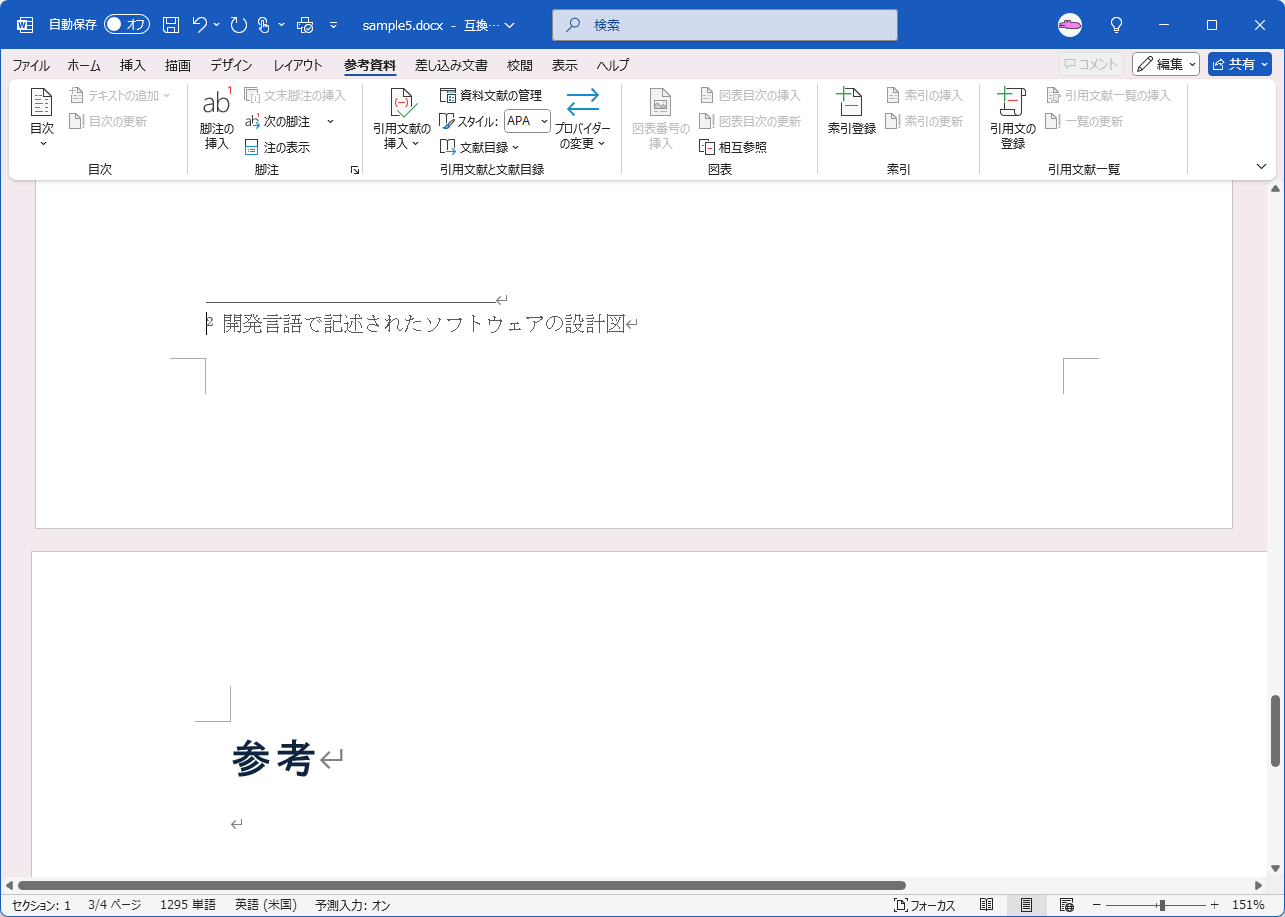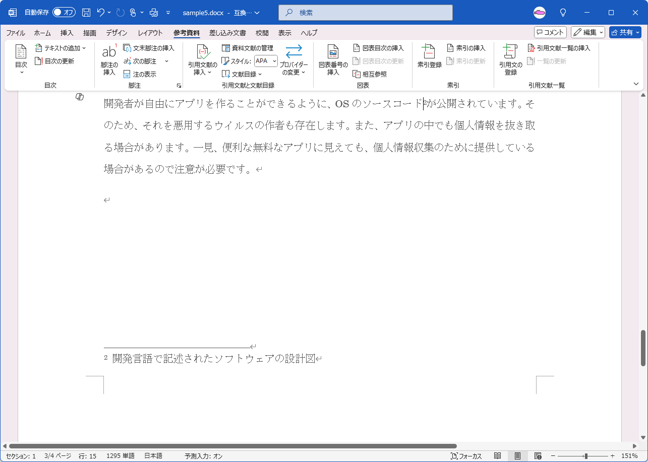 - 脚注内容の領域に「開発言語で記述されたソフトウェアの設計図」と入力します。