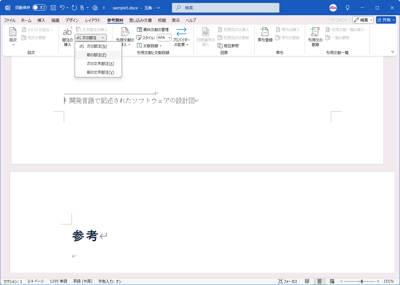 [参考資料]タブの[脚注]グループの[次の脚注]の▼をクリックして[前の脚注]を選択すると、前の脚注に移動します。