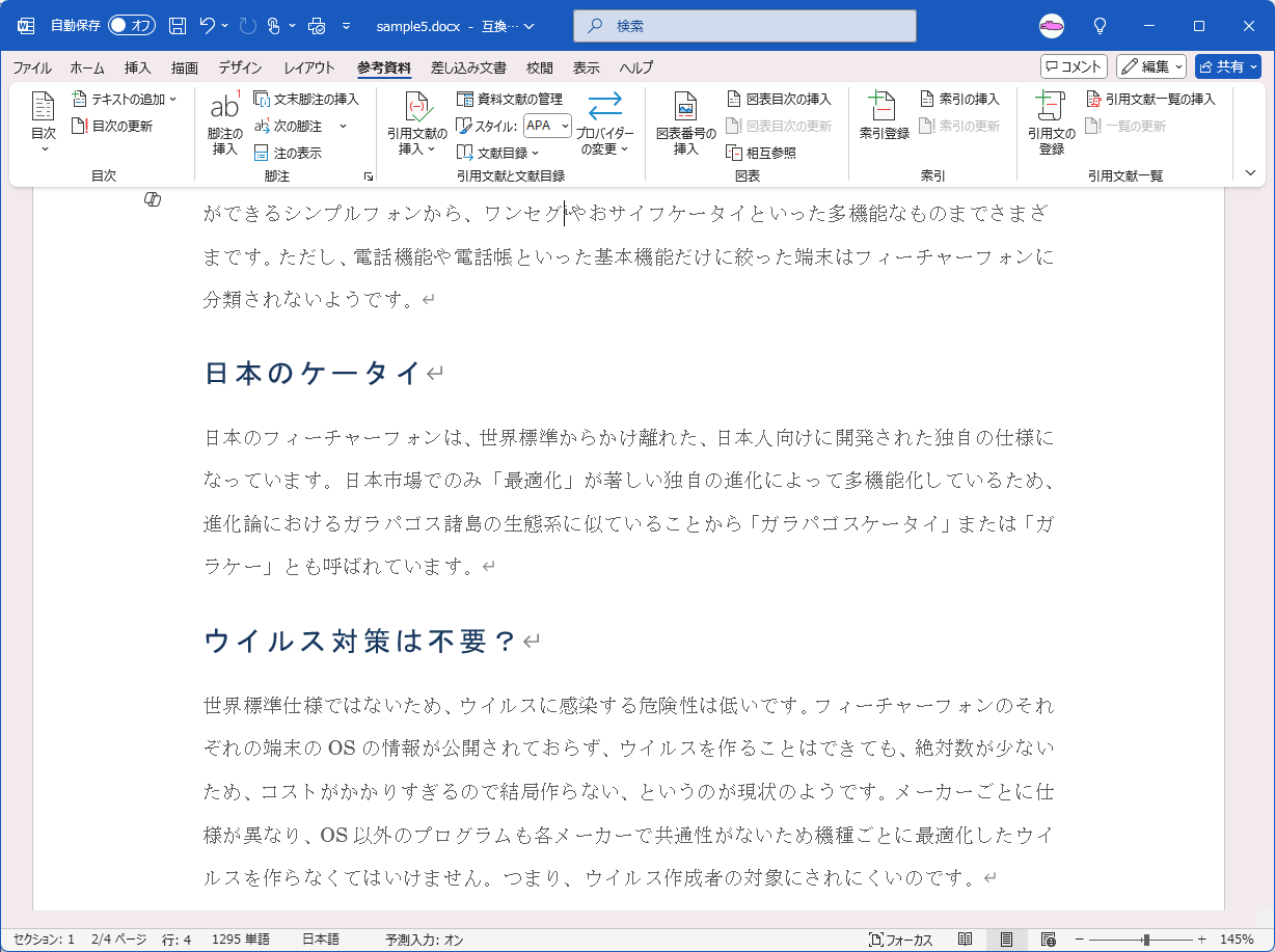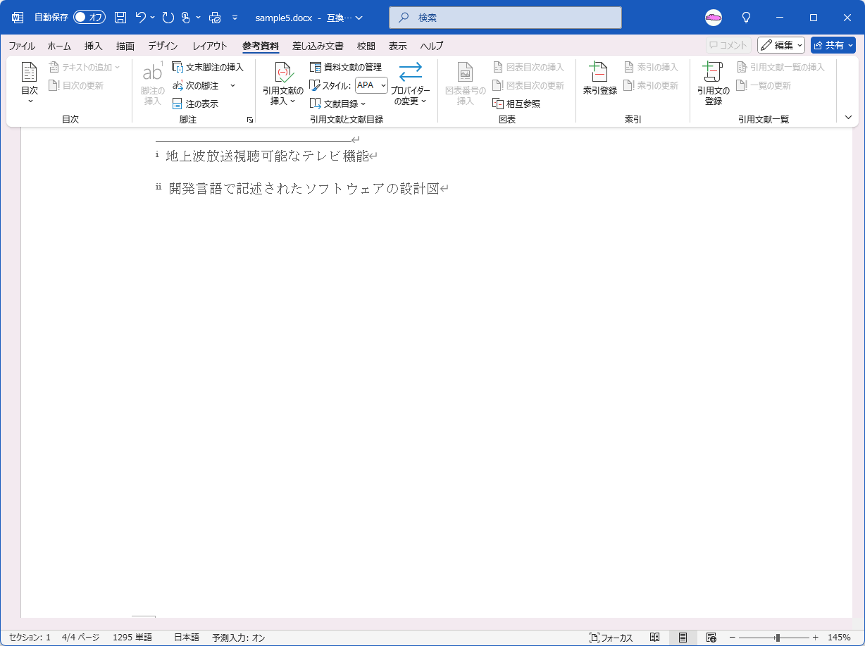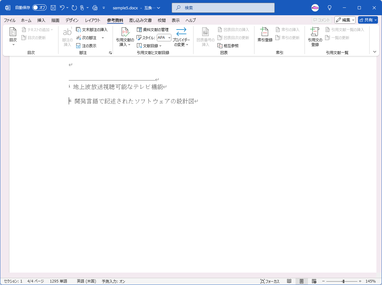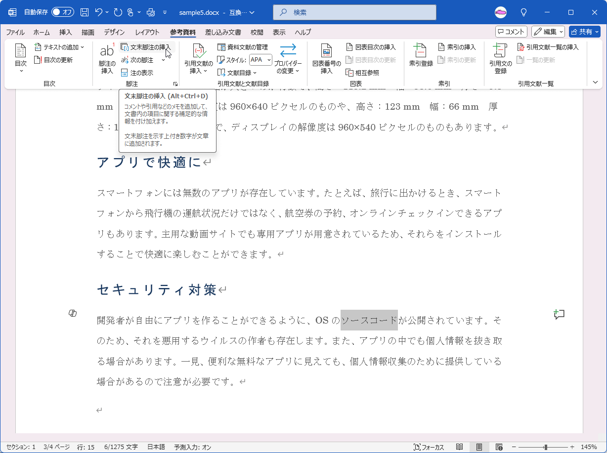 専門用語に対して文末に脚注を挿入することができます。ここでは、サンプルファイルを開き、それぞれの語句に文末脚注をつけてみましょう。なお、脚注記号は既定のままでOKです。