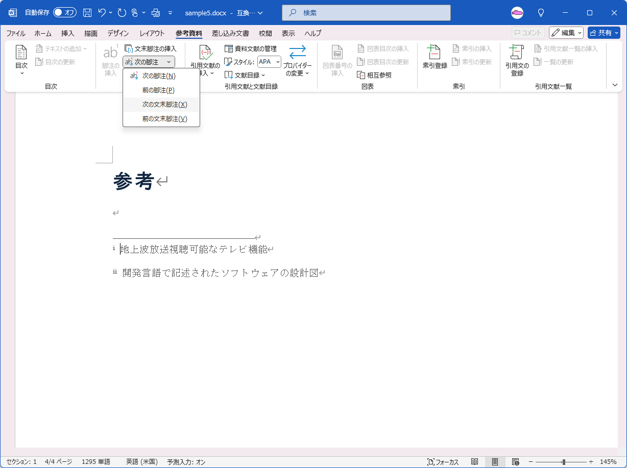- [脚注]グループの[文末脚注の挿入]を選択します。