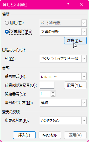 - [脚注と文末脚注]ダイアログボックスの[変換]ボタンをクリックします。