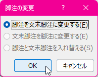 - [文末脚注を脚注に変更する]オプションボタンがオンに設定されていることを確認して、[OK]ボタンをクリックします。