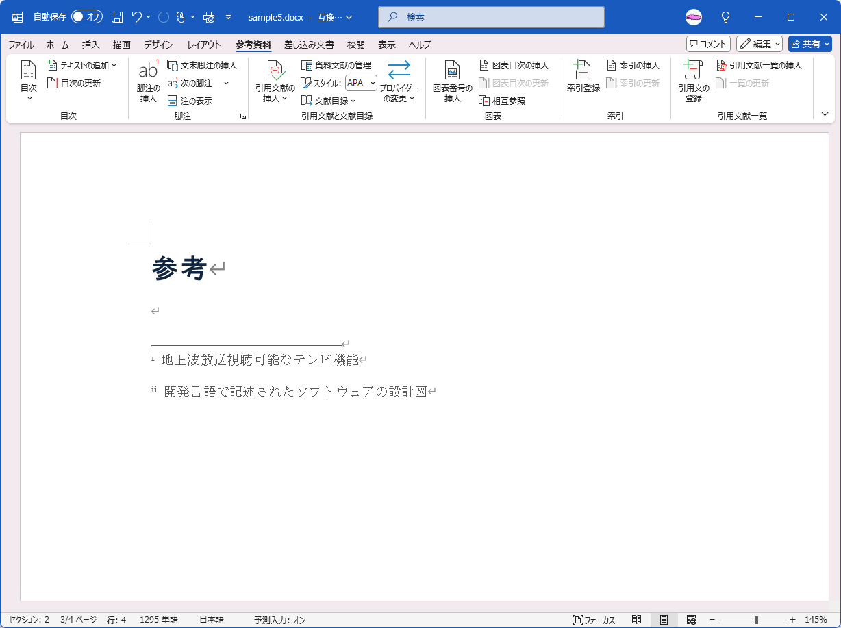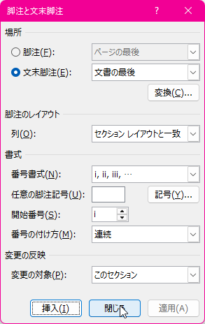 - [脚注と文末脚注]ダイアログボックスの[閉じる]ボタンをクリックします。