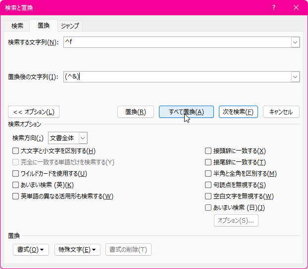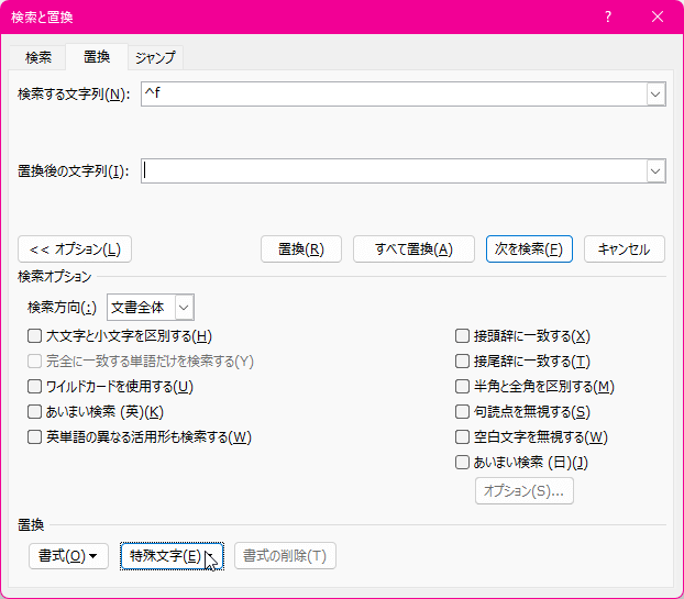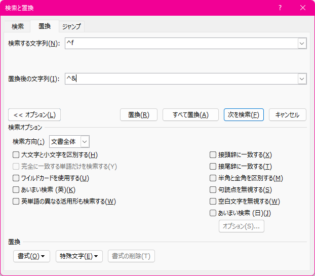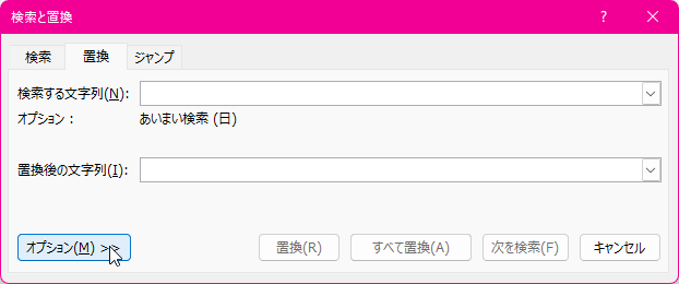 - [検索と置換]ダイアログボックスの[オプション]ボタンをクリックして、オプションを展開します。