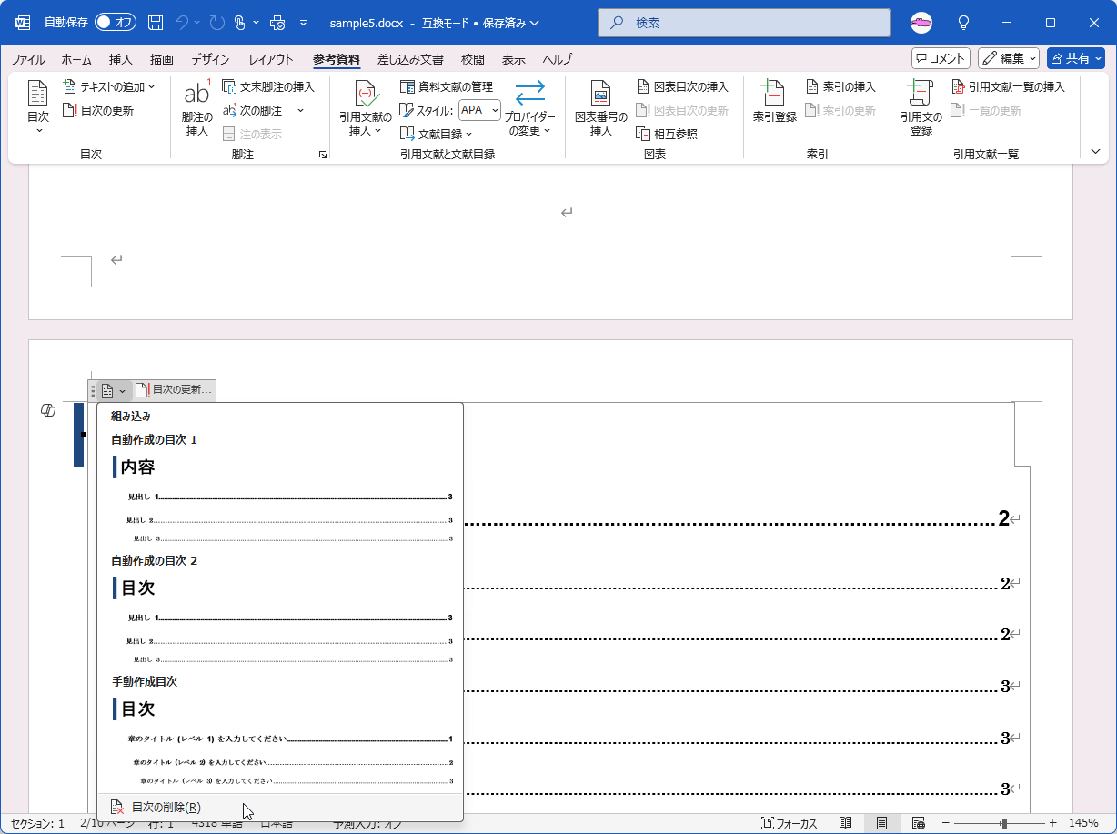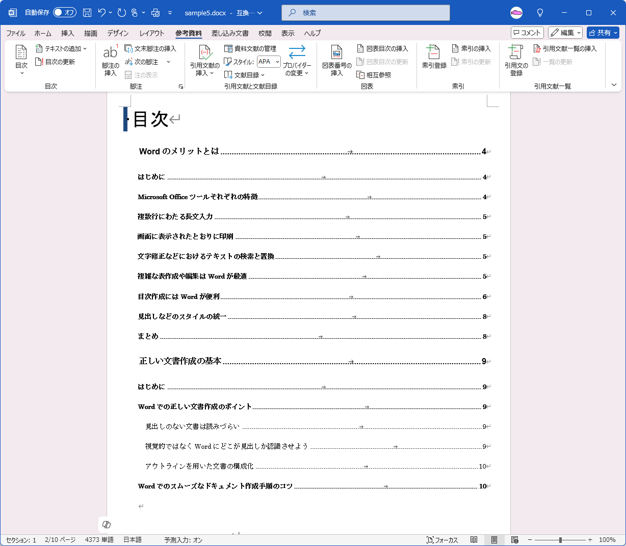 サンプルファイルには、すでに組み込みの目次が挿入されています。自分でやってみたい場合は、まず目次を削除してからトライしてみてください。