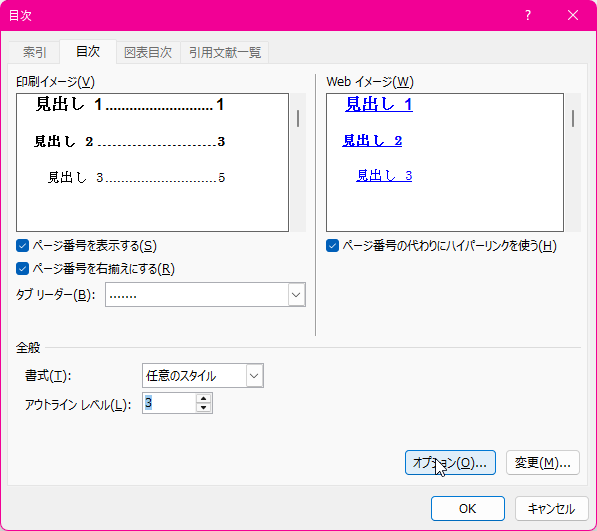 [目次]ダイアログボックスの[オプション]ボタンをクリックします。