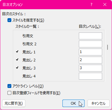 - [目次オプション]ダイアログボックスの[スタイルの一覧]にリストされた個々のスタイルに対応する[目次レベル]を数値で指定して[OK]ボタンをクリックします。