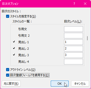 ユーザー設定の目次において、個々のスタイルの目次のレベルを指定したり、目次登録フィールドを使用したりするには、[目次]ダイアログボックスの[オプション]ボタンをクリックします。