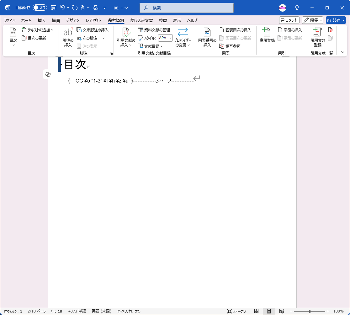- Altキーを押しながらF9を押すと、目次登録フィールドが表示されました。