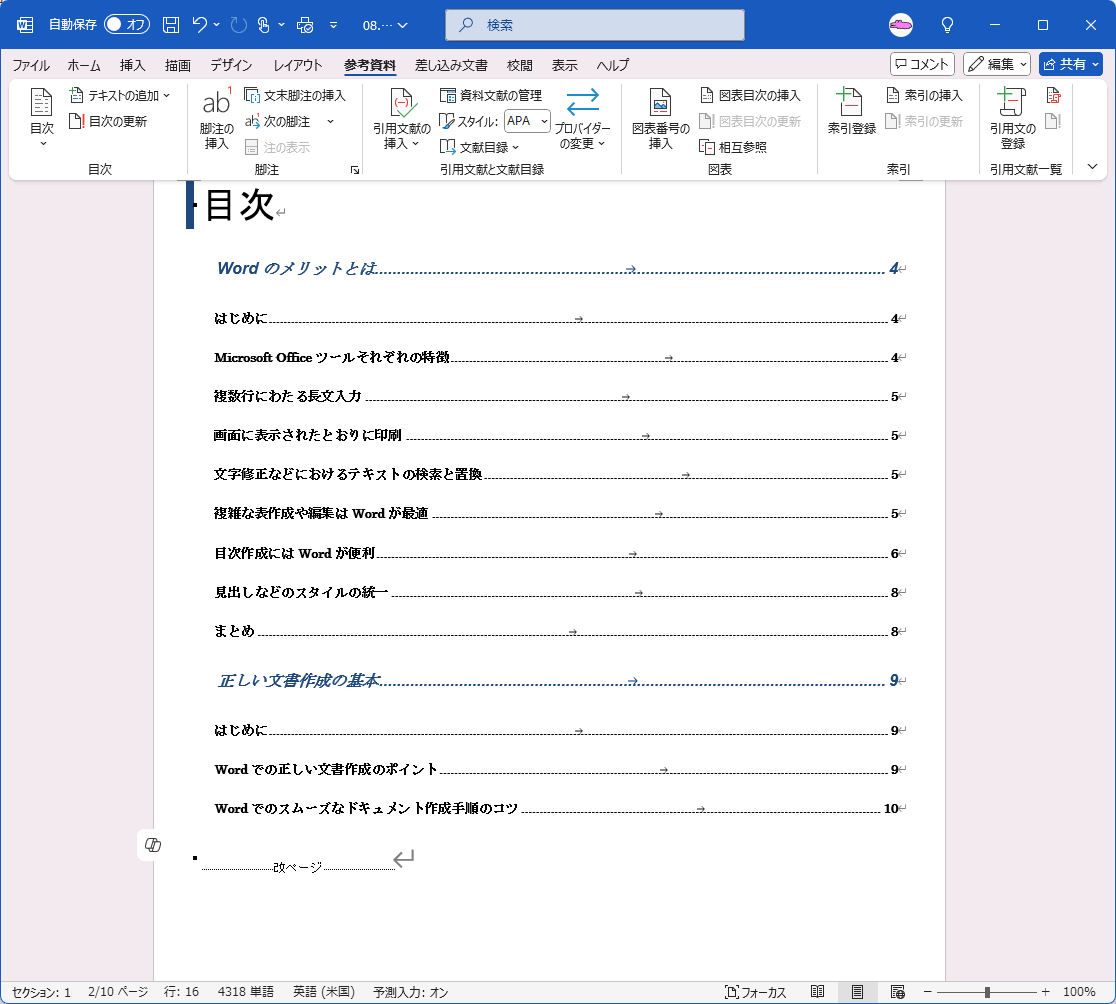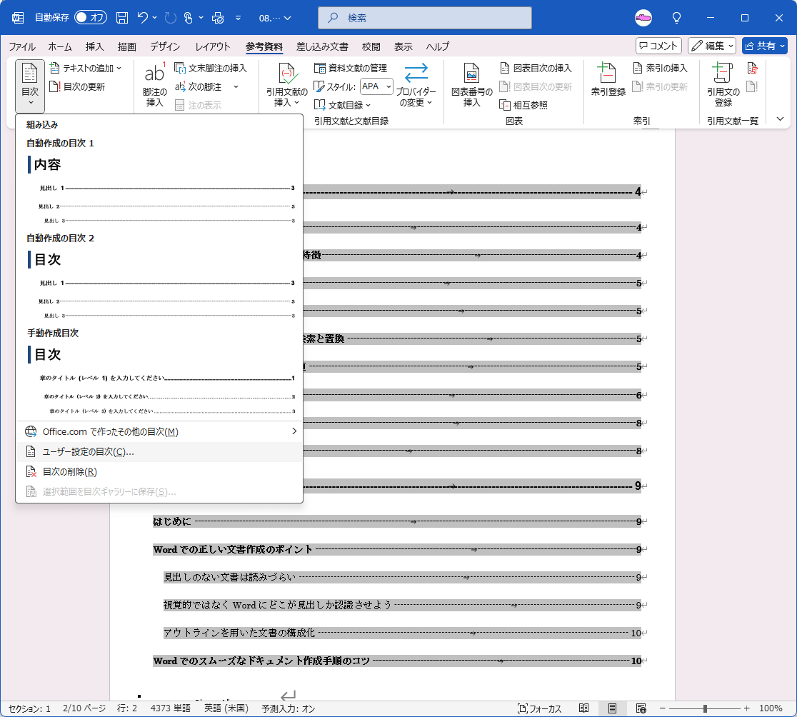 - [参考資料]タブを開き、[目次]グループの[目次]をクリックします。