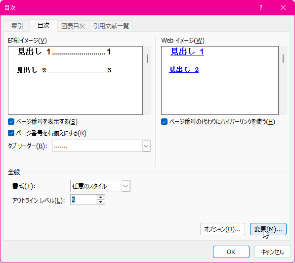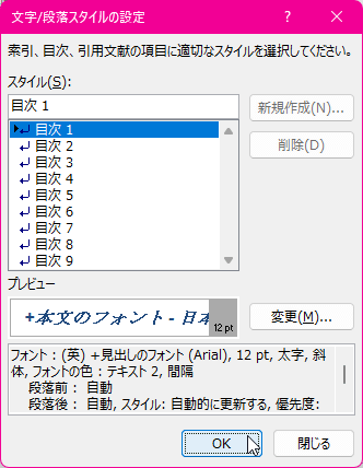 - [目次1]を選択して[変更]ボタンをクリックします。