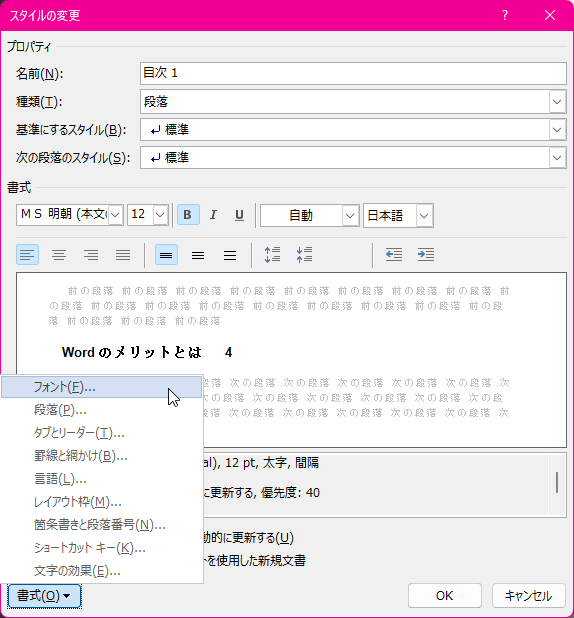 - [書式]ボタンをクリックし、[フォント]を選択します。
