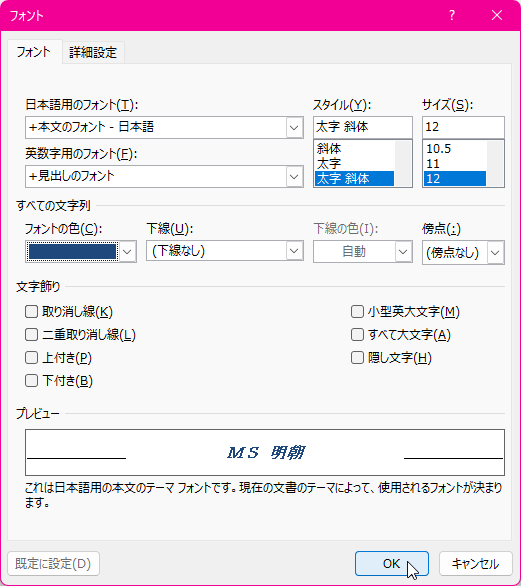 - [スタイル]ボックスから[太字 斜体]を選択します。
