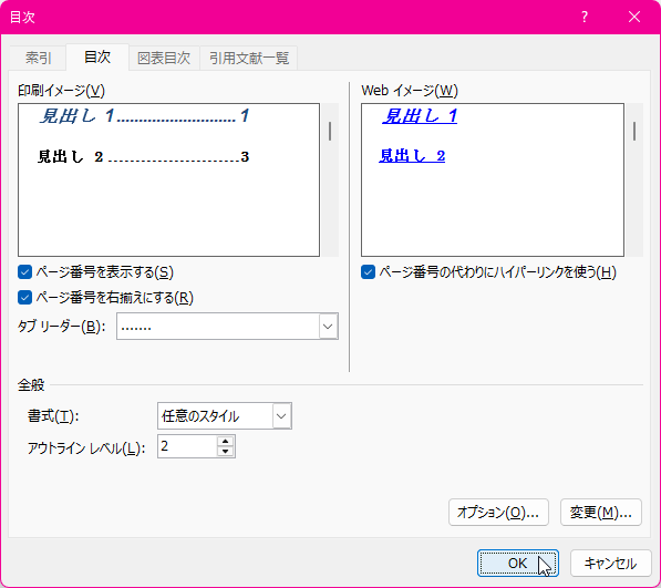 組み込みの目次ではなく、[目次]ダイアログボックスを使用して目次を挿入した場合は、後で自由に目次の書式を変更することができ、タブリーダーやスタイルを変更できます。