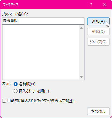 - [ブックマーク名]ボックスにブックマーク名を入力します。ここでは「参考資料」と入力します。