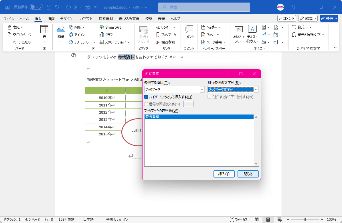 - ブックマークの文字列が相互参照として挿入されました。[閉じる]ボタンをクリックします。