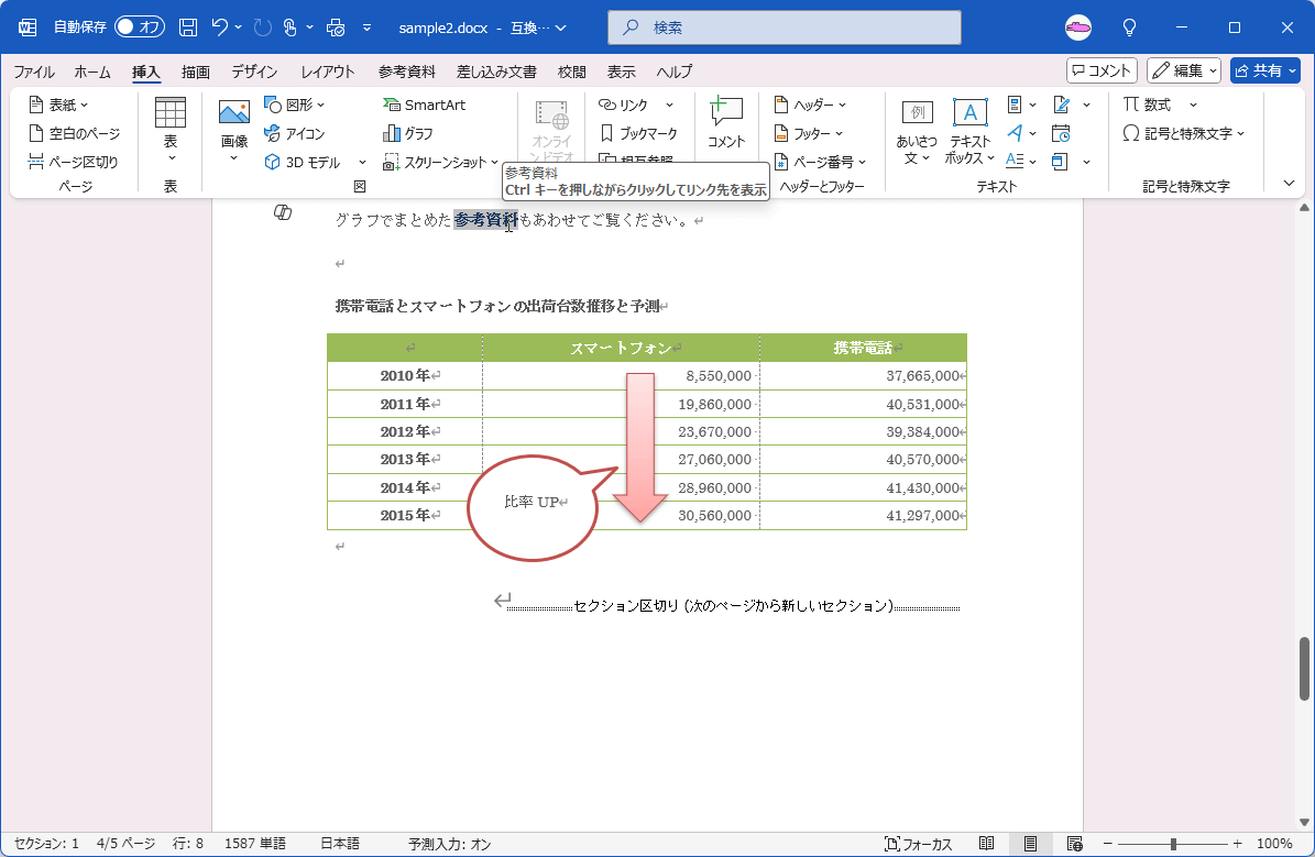 - [挿入]タブを開き、[リンク]グループの[相互参照]をクリックします。