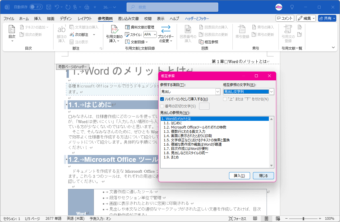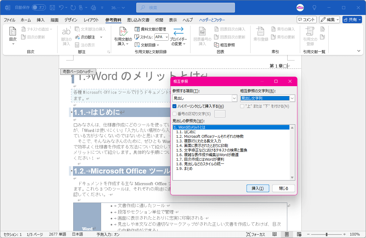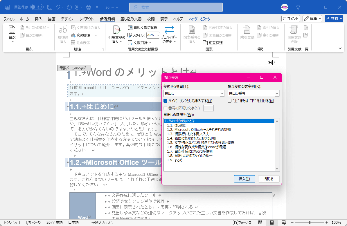- 見出し番号を入れるには、[相互参照]ダイアログボックスの[参照する項目]を「見出し」に設定し、[相互参照の文字列]を「見出し番号」に設定して、見出しの参照先を選択し、[挿入]ボタンをクリックします。