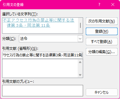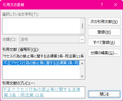 対象となる文字列を選択して[参考資料]タブの[引用文献一覧]グループの[引用文の登録]をクリックし、[引用文の登録]ダイアログボックスで登録できます。ショートカットキーはAlt+Shift+Iです。分類一覧にない場合は、8~16の数字から空いている数字を選択し、その数字を新しい分類名に変更できます。