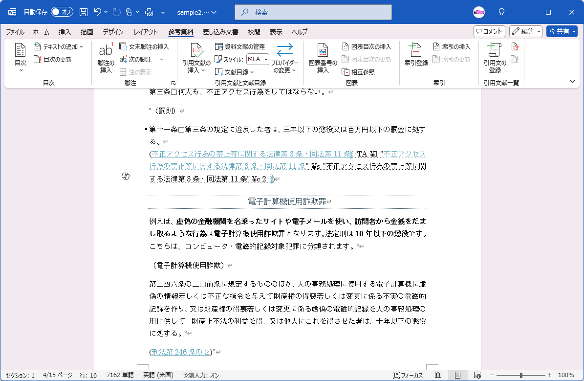 - 対象となる文字列を選択して[参考資料]タブの[引用文献一覧]グループの[引用文の登録]をクリックします。