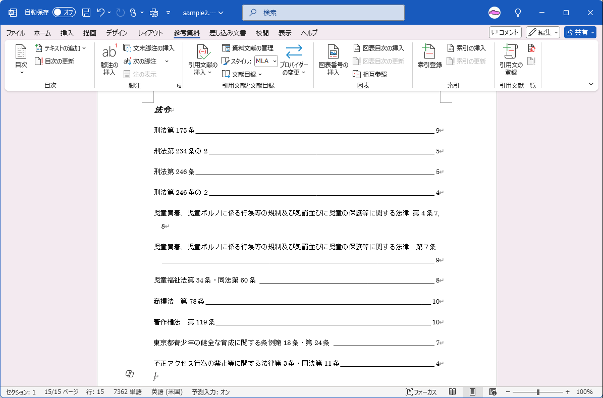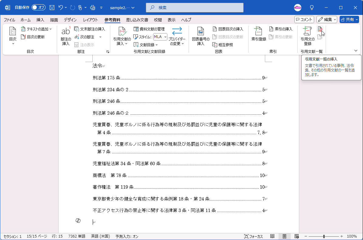 - [参考資料]タブの[引用文献一覧]グループの[引用文献一覧の挿入]をクリックします。カーソルの位置はどこでもOKです。