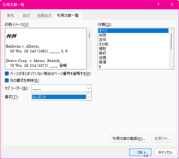 - [引用文献一覧]ダイアログボックスの[書式]ボックス一覧から変更したい書式を選択し[OK]ボタンをクリックします。