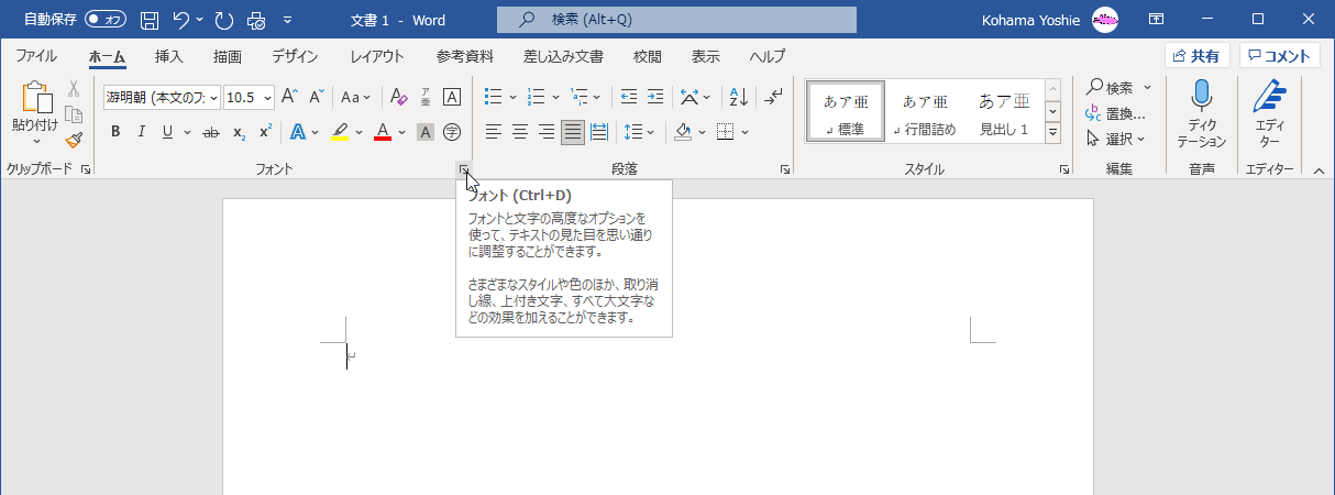 - 白紙の文書を作成し、[ホーム]タブの[フォント]グループ右下のダイアログボックス起動ツールをクリックします。
