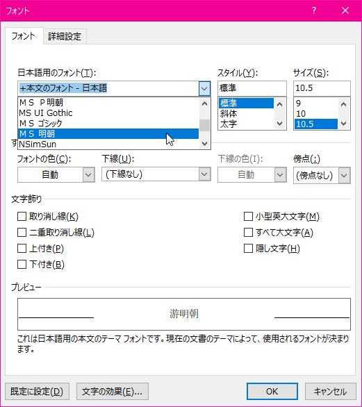 - [フォント]ダイアログボックスが表示されたら、「日本語用のフォント]のフォント一覧より「MS明朝」を選択します。