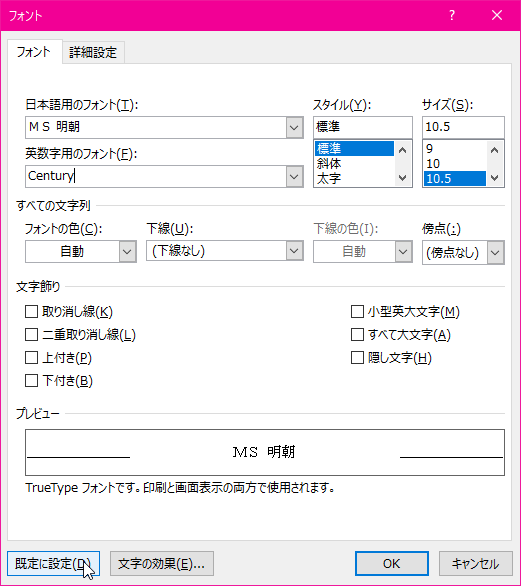 - [サイズ]は「10.5」が選択されていることを確認し、[既定に設定]ボタンをクリックします。