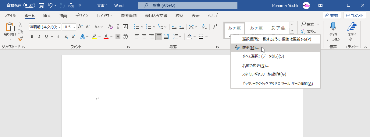 - 白紙の文書を作成し、[ホーム]タブの[スタイル]一覧から[標準]を右クリックして[変更]をクリックします。