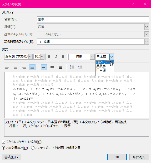 - [スタイルの変更]ダイアログボックスのフォント対象を選択します。日本語、英数字を統一するには[(すべて)]を選択します。
