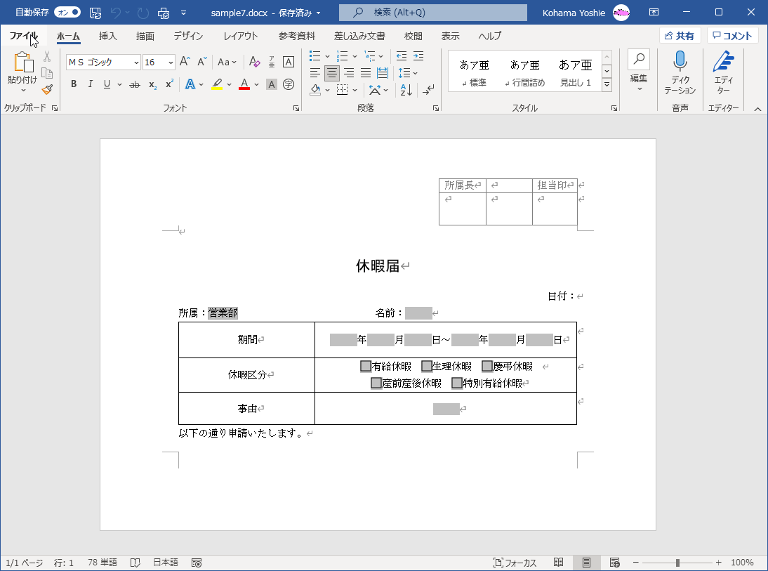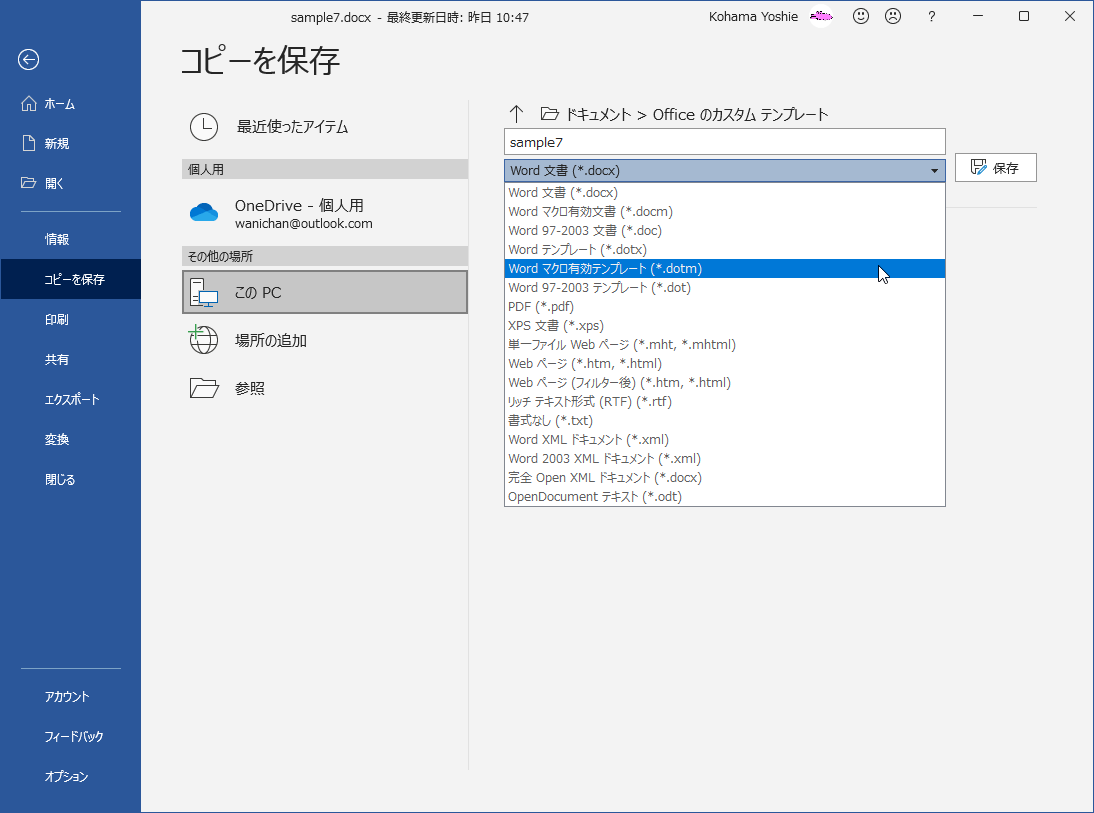OneDrive上の文書をWordマクロ有効テンプレートとして保存