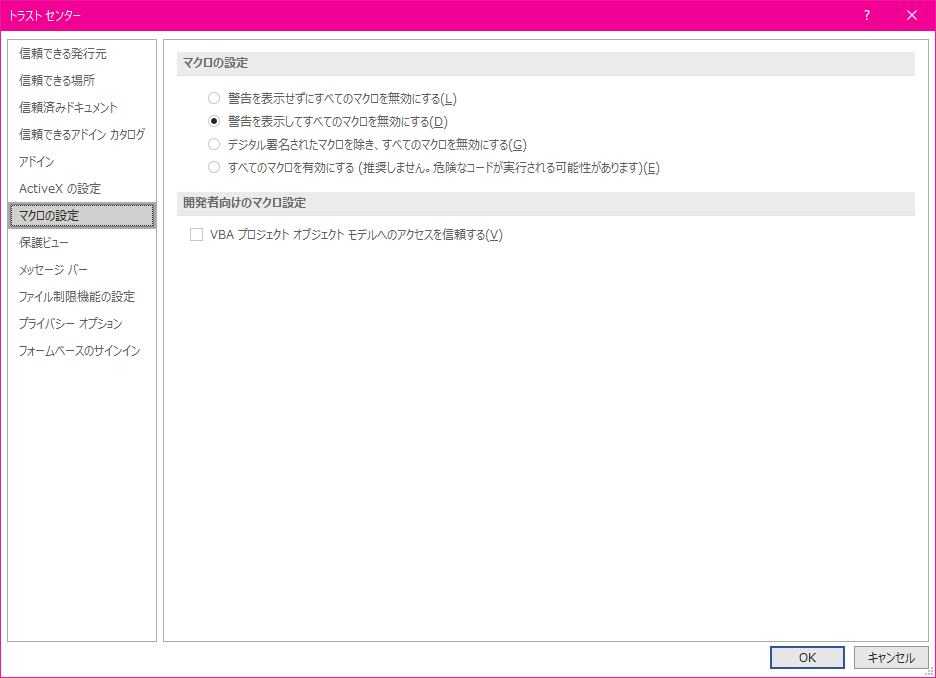 既定では、[警告を表示してすべてのマクロを無効にする]ように設定されています。マクロの設定は以下の4パターンあります。