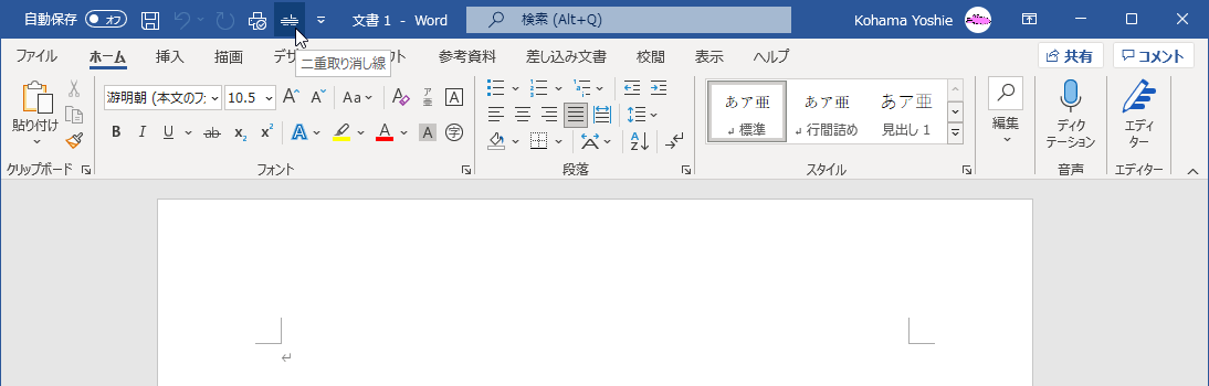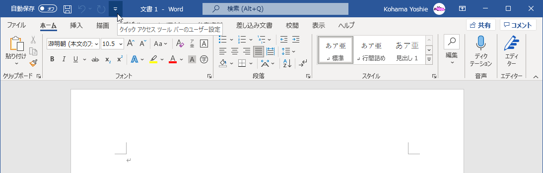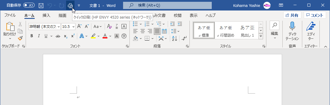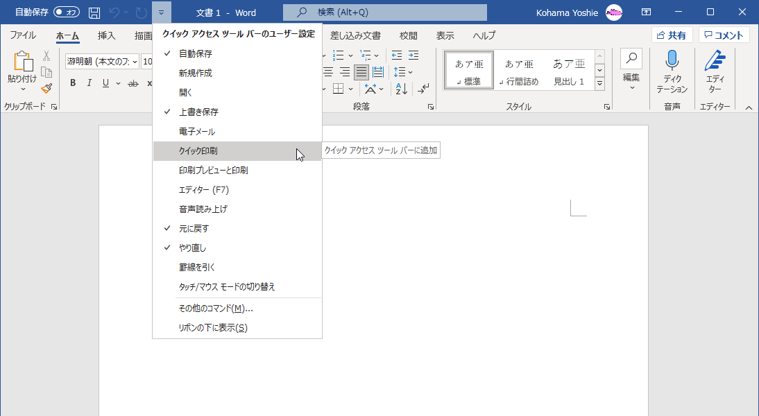 既定のクイックアクセスツールバーには[自動保存][上書き保存][元に戻す][繰り返し]が表示されています。頻繁にドキュメントを印刷する場合は、クイックアクセスツールバーに[クイック印刷]コマンドを追加するとよいでしょう。