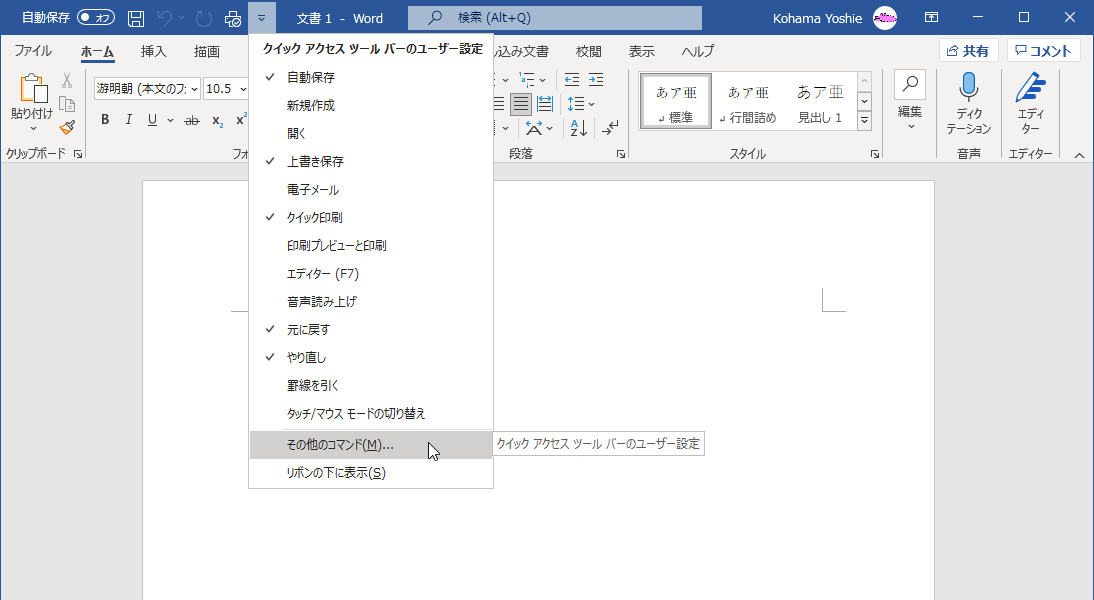 - クイックアクセスツールバーのカスタマイズメニューより[その他のコマンド]を選択します。