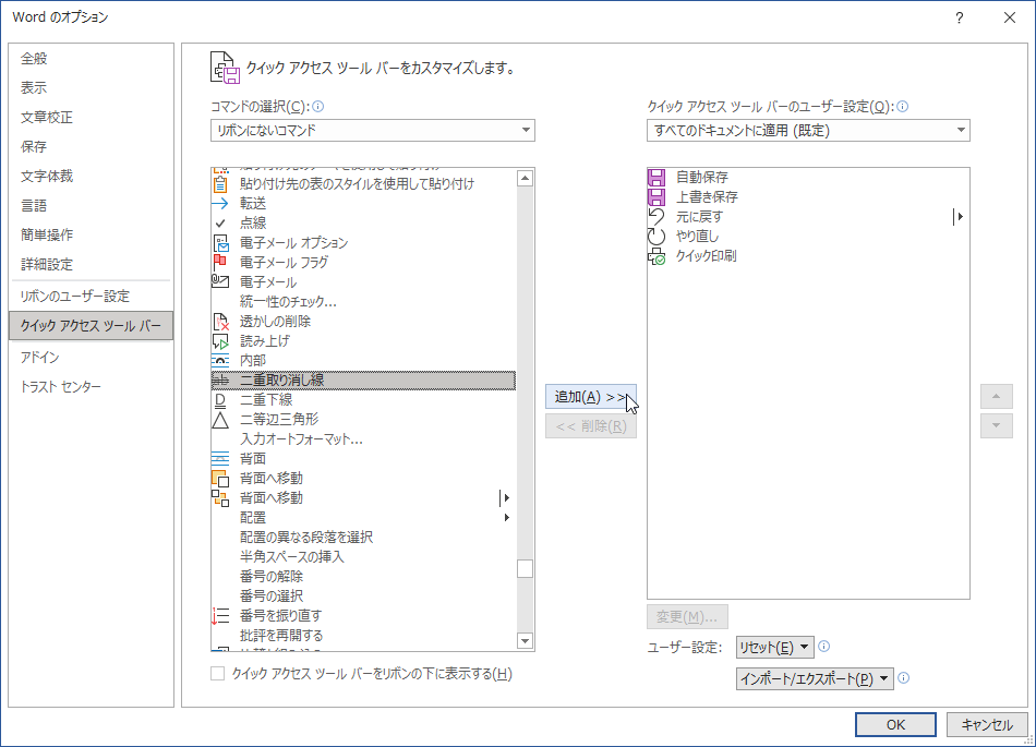 - [Wordのオプション]ダイアログボックスの[クイックアクセスツールバー]が開かれたら、追加したいコマンドを選択して[追加]ボタンをクリックします。