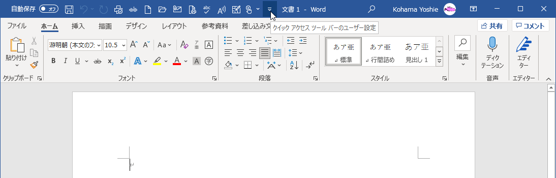 クイックアクセスツールバーは既定ではタイトルバーの左側に配置されていますが、リボンの下に移動することもできます。リボンの下に移動することで、クイックアクセスツールバーに追加できるコマンドボタンをたくさん増やせます。