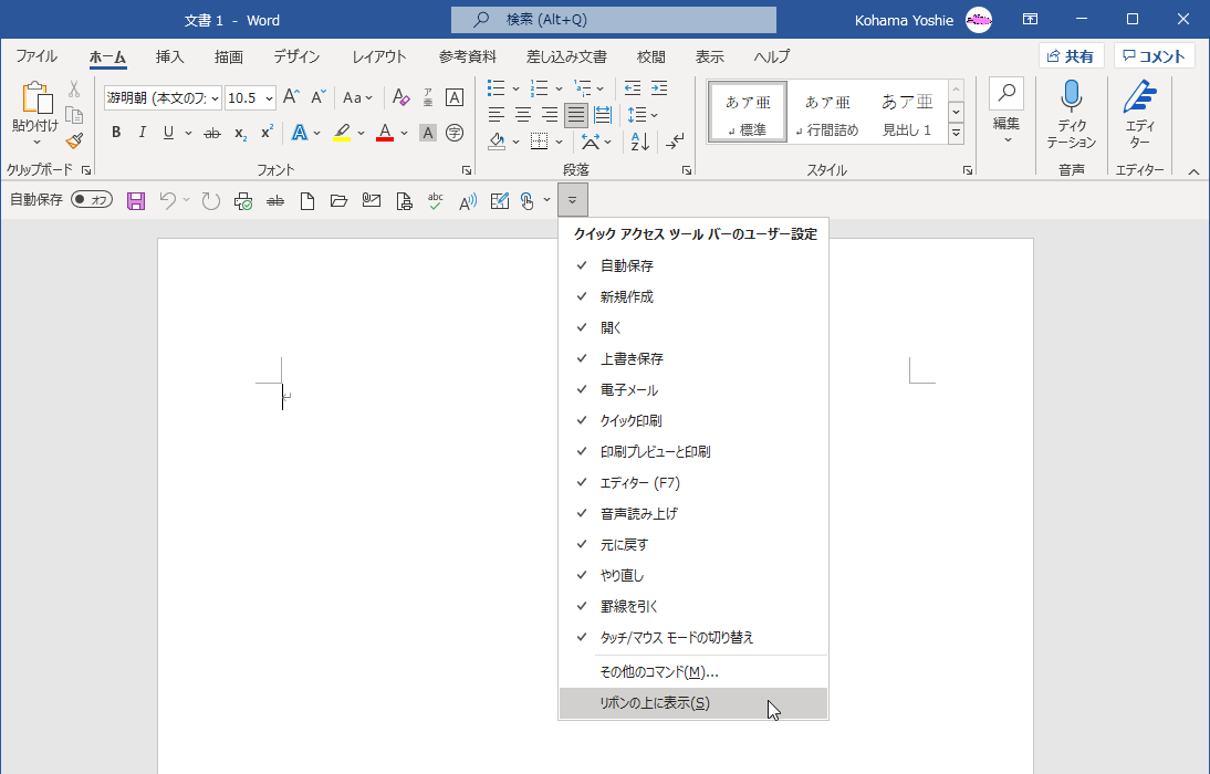 クイックアクセスツールバーを元の場所に戻すには、クイックアクセスツールバーの▼をクリックして、[リボンの上に表示]をクリックします。
