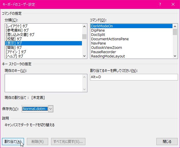 - [割り当てるキーを押してください]ボックスにカーソルを移動して、Altキーを押しながらDキーを押します。