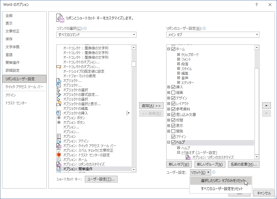 既存のリボンタブにグループやコマンドを追加したあと、リボンをリセットするには、[Wordのオプション]の[リボンのユーザー設定]ウィンドウを開き、リセットしたいタブを選択して[リセット]ボタンをクリックし、[選択したリボンタブのみリセット]を選択します。ユーザー設定のタブはリセットできません。