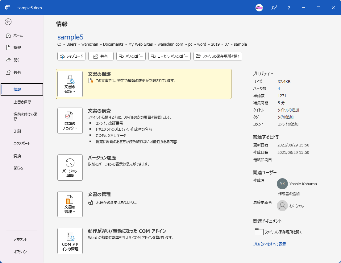 ファイルは開くことができても、[ファイル]タブの[情報]を選択すると「この文書では、特定の種類の変更が制限されています。」と表示されている場合、編集が制限されている可能性があります。