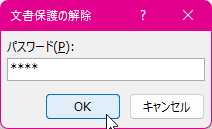 - [文書保護の解除]ダイアログボックスが開いたら、パスワードを入力し[OK]ボタンをクリックします。