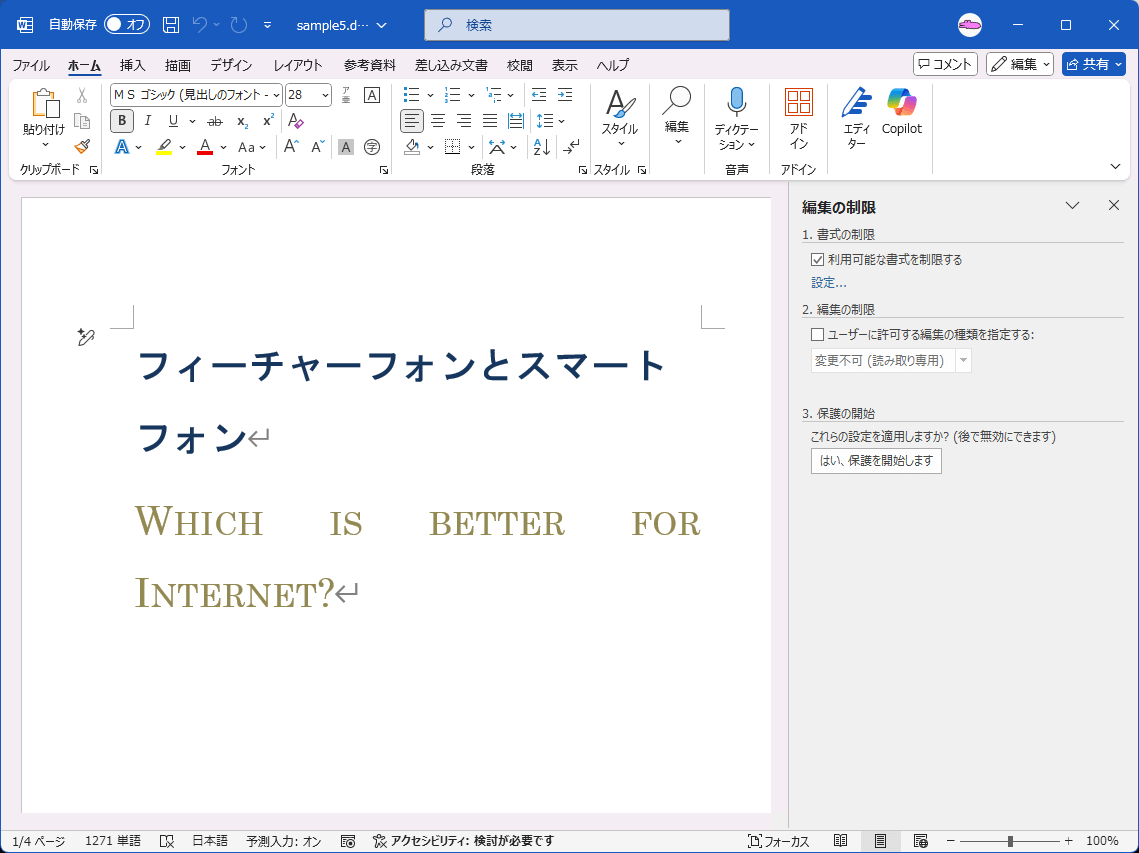 - [ホーム]タブなどをクリックして、書式の変更や編集ができるようになったことを確認します。