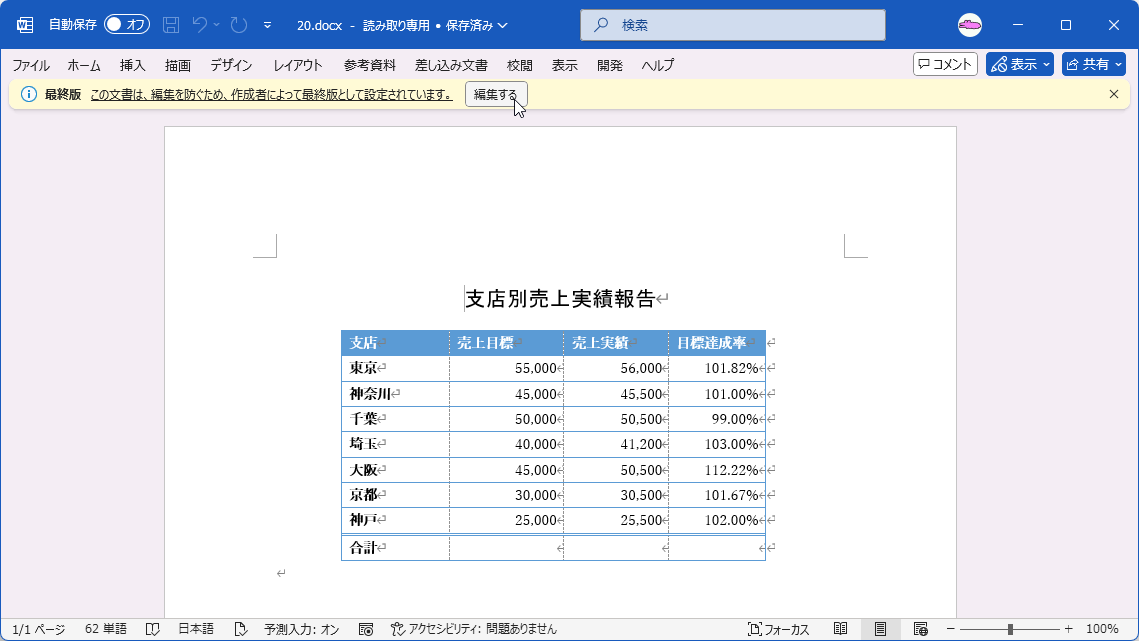 情報バーの[編集する]ボタンをクリックすると、署名が削除されるという情報メッセージが表示されます。