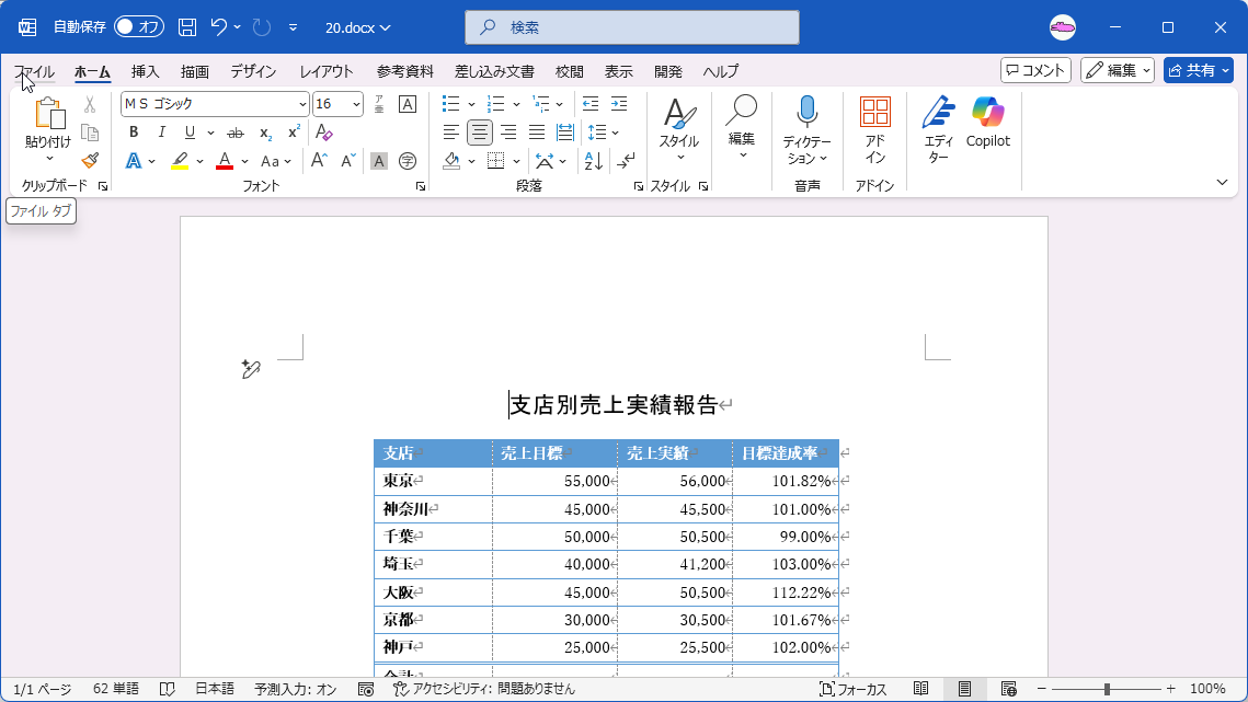 - [ファイル]タブを開き、ホーム画面を表示します。