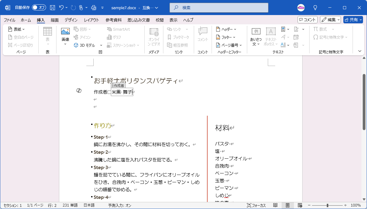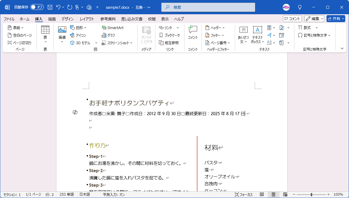 - 「作成日:」と入力し、[挿入]タブを開きます。