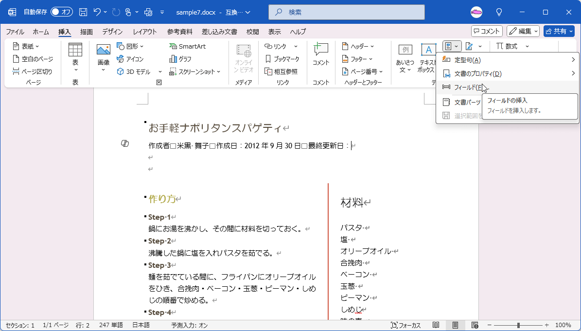 自動的に更新される情報を提供できるフィールドを挿入するには